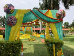 📸 Royal Wedding at Shri Kamal Garden, Indore – Traditional décor with floral mandap and open-air lawn setup.